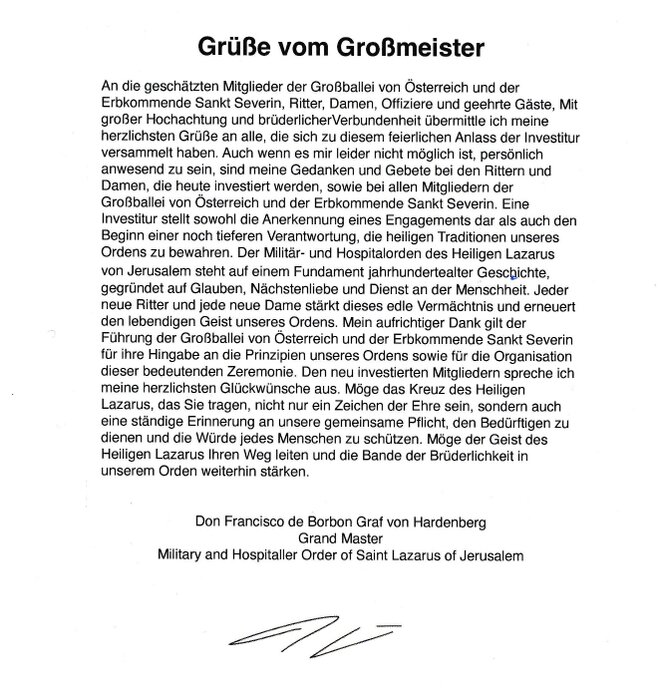 Nach dem obligaten Gruppenfoto im Pfarrgarten fand sich die Investiturgesellschaft beim Heurigen Mayer am Pfarrplatz zum gemeinsamen Abendessen ein. Hier wurde seitens der Großballei und der Erbkommende noch besonders unserem Großmeister, S.H. The Chev. Don Francisco de Borbón Graf von Hardenberg, GCLJ-J, gedankt, der für jedes Mitglied der Investiturgesellschaft seine Grußworte in englischer und deutscher Sprache verteilen ließ. Nach dem Tischgebet des Geistlichen Priors wurde das gemeinsame Abendessen in feierlicher, der Fastenzeit angemessener Form, eingenommen.Unser Großmeister entschuldigte sich, dass er wegen anderer wichtiger Verpflichtungen an dieser Doppelinvestitur nicht teilnehmen konnte, richtete aber eine schriftliche Gruß0botschaft an alle Teilenehmer: